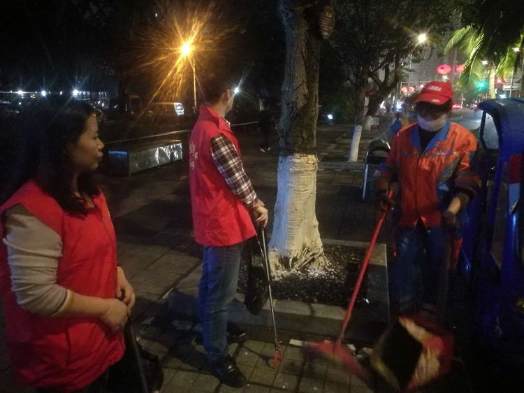 为进一步做好巡查工作,志愿者跟正在工作的环卫工了解最近街边卫生状况。