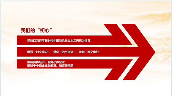课上王治平书记通过中国共产党人的初心和使命,就是为中国人民谋幸福,为中华民族谋复兴,引伸到金融行业的党员干部的“初心”具体的指向和涵义,就是始终坚持以习近平新时代中国特色社会主义思想为指导,增强“四个意识”、坚定“四个自信”、做到“两个维护”,承担起新时代的历史使命和责任担当,守住金融初心,回归金融本源,以提升价值创造力、风险防控力和市场竞争力为出发点,坚持“服务实体经济、服务小微企业”不动摇,努力破解中小微企业融资难、融资贵问题,助推地方经济高质量发展。